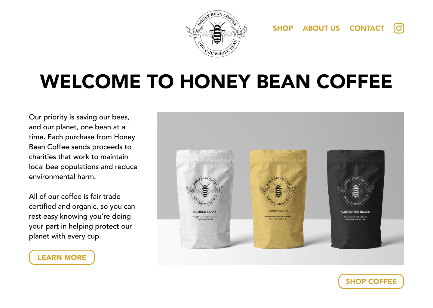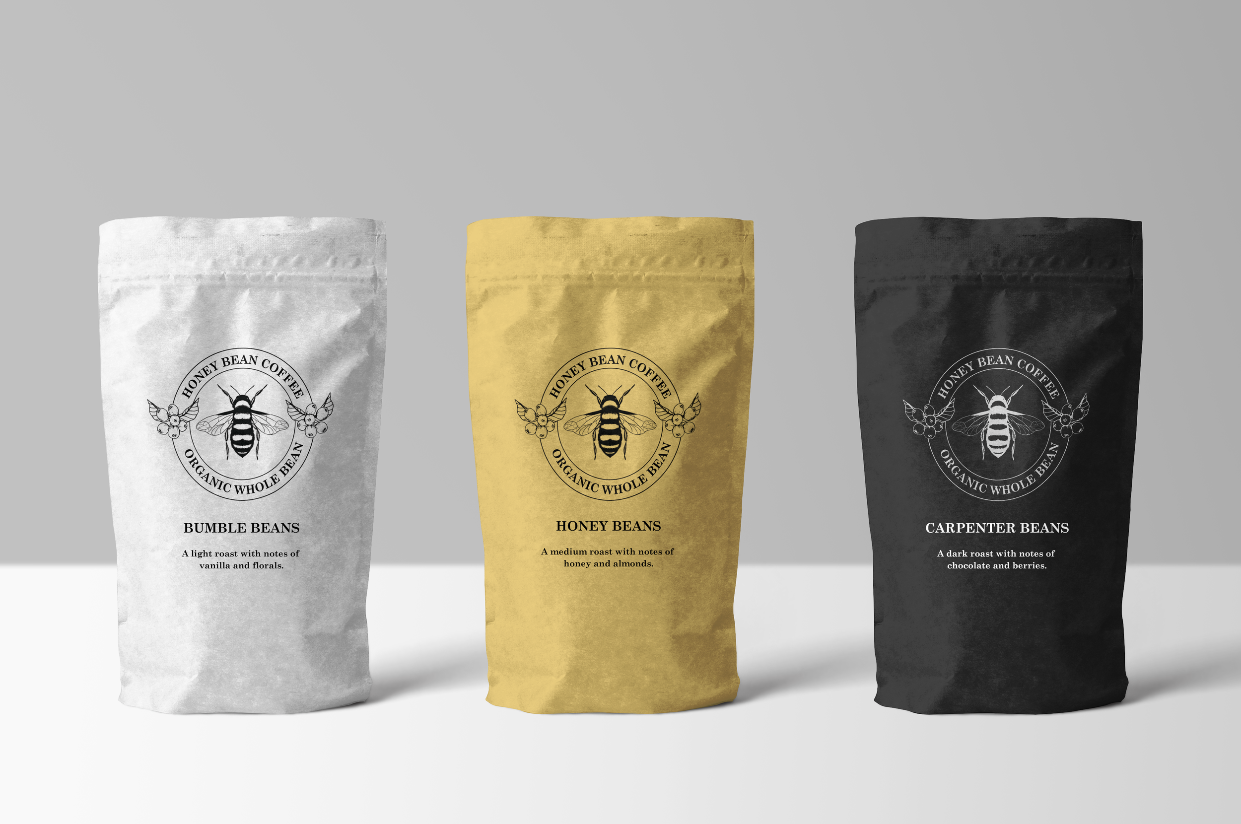 Honey Bean Coffee began as a mock-up for a colleague who wanted to start selling coffee, but with a brand focused on the environment. As bees are incredibly important pollinators, they quickly became the brand focus along with different native plants, and of course the fruit of the coffee plant.